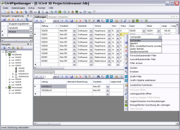 Der CivilPipes-Manager dient als zentrale Datenverwaltung. In Civil 3D erfasste oder aus BaSYS importierte Daten werden in übersichtlicher tabellarischer Form dargestellt. Beim Import der Objekte aus Civil 3D werden sämtliche Geometrieinformationen in der Datenbank gespeichert. Der Anwender ist jederzeit in der Lage, eine Grafik auf Grundlage des aktuellen Bestandes in der CAD-Oberfläche zu generieren. Der integrierte Navigator ermöglicht eine übersichtliche Darstellung der Kanalobjekte in Form einer Baumstruktur. Daten können über den Navigator selektiv angezeigt werden. Die Abfrage von Daten ist durch einen erweiterten Formularfilter auf einfache Weise möglich. Fehlende Informationen, die für eine Dimensionierung benötigt werden, lassen sich durch weitere Funktionen komfortabel ergänzen. Die frei definierbaren Bibliotheken stehen in den entsprechenden Datenfeldern der Tabellen als Auswahllisten zur Verfügung. Die Inhalte der CivilPipes-Datenbank können über das Microsoft-Produkt MS Excel exportiert werden.