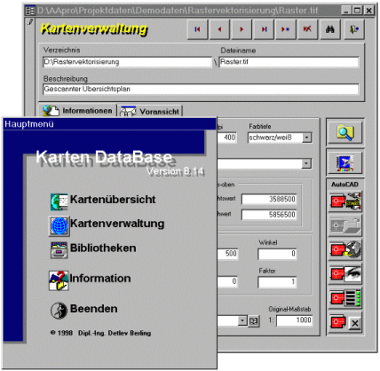Der KartenManager verwaltet Pixeldateien sowie AutoCAD-Vektordateien. Karteninformationen, die in der Datenbank gespeichert sind, können zur Visualisierung unter AutoCAD genutzt werden. Zusätzliche CAD-Funktionen gewährleisten eine einfache Lagebestimmung und blattschnittfreie Verwaltung der Grafikdaten.